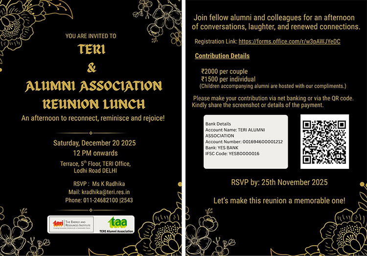 Alumni are at the heart of TERI’s legacy as well as its future. Guided by TERI’s mandate to promote sustainable development, our alumni serve as force multipliers, carrying forward its impact across diverse domains and regions. By remaining engaged, alumni can: