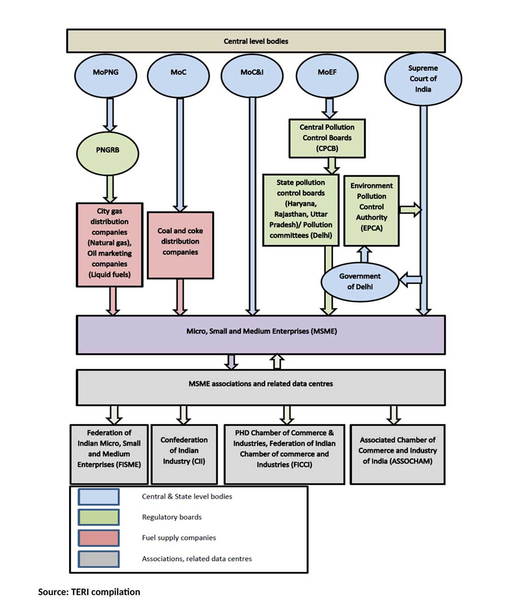 The regulations in the MSME sector have provisions for upgrading technology and application of new clean technologies, and there is scope for capitalising on this. The role of the government in facilitating creation of necessary infrastructure to ensure reliable supply or supply of natural gas at subsidised rates is also important to enable large-scale adoption of natural gas by the MSMEs. Various government departments have programmes and schemes related to enhancing clean energy measures, but are working in silos. Several government ministries, regulatory boards, natural gas supply companies, MSME units and associations, and related data centres are relevant stakeholders for switching over to clean fuel and for promoting energy efficiency initiatives in the MSME sector (see, figure). Therefore, it is important that proper coordination between various related programmes and schemes on clean energy, energy efficiency, technology upgradation, database generation, reporting and monitoring and capacity building takes place and that there is a confluence of actions at the delivery point. It is imperative to provide an all-round support to the MSME units extended through cluster level stakeholder engagements involving government agencies, city gas distribution companies, legal and financial institutions, and local industry associations/chambers of commerce.