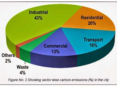 - The Phase I of the project very successfully articulated and submitted a detailed 'Action Plan' comprising various components together, which will drive sustainable development in the city. Along with the action plan, baseline carbon estimation was undertaken at the city level where the emissions from the city were calculated in a very methodical manner. The study findings revealed that the net emissions from the city, from various sectors account to approximately 2.8 Million tCO2e, with per capita emissions to be 2.51 Metric tCO2e. Sector wise emissions are illustrated in Figure 2