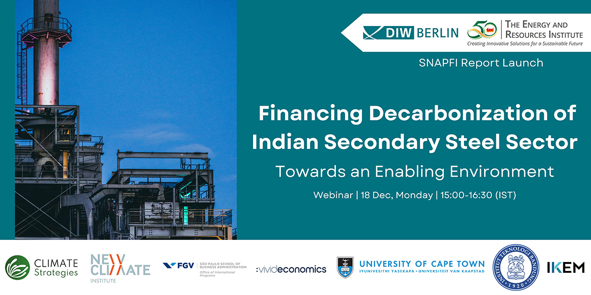 The Energy and Resources Institute is organizing a webinar on the launch of its report titled 'Financing the Decarbonization of Indian Secondary Steel Sector: Towards an Enabling Environment', undertaken in association with DIW Berlin, on 18th December 2023 from 15:00-16:30 (IST). The webinar launch of the report would be accompanied by an insightful panel discussion among key stakeholders from industry, financial institutions, academia, and the policy sphere.