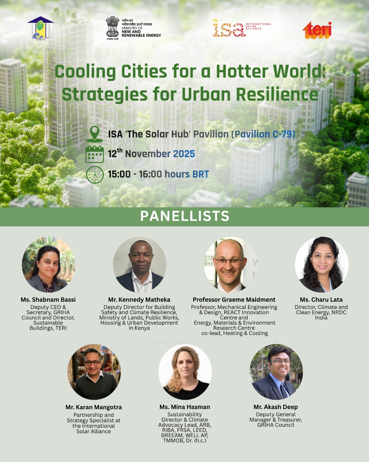 The proposed panel session “Cooling Cities for a Hotter World: Strategies for Urban Resilience” jointly curated by ISA and GRIHA Council will convene city leaders, planners, health experts, industry, and finance to convert global heat‑risk evidence into locally actionable programs, policy and codes and urban planning that prioritize equity, speed, and scale. The dialogue will deliberate on efficient cooling technologies for strengthening climate-resilience at city level. The joint session will align sustainable cooling with public health, productivity, and just transition objectives, while reducing peak electricity demand and enhancing energy reliability during extreme heat. Within a global evidence base, the session intends to translate lessons on passive and nature‑based solutions, efficient cooling, and resilient energy into practical frameworks that cities can finance and deliver at scale.