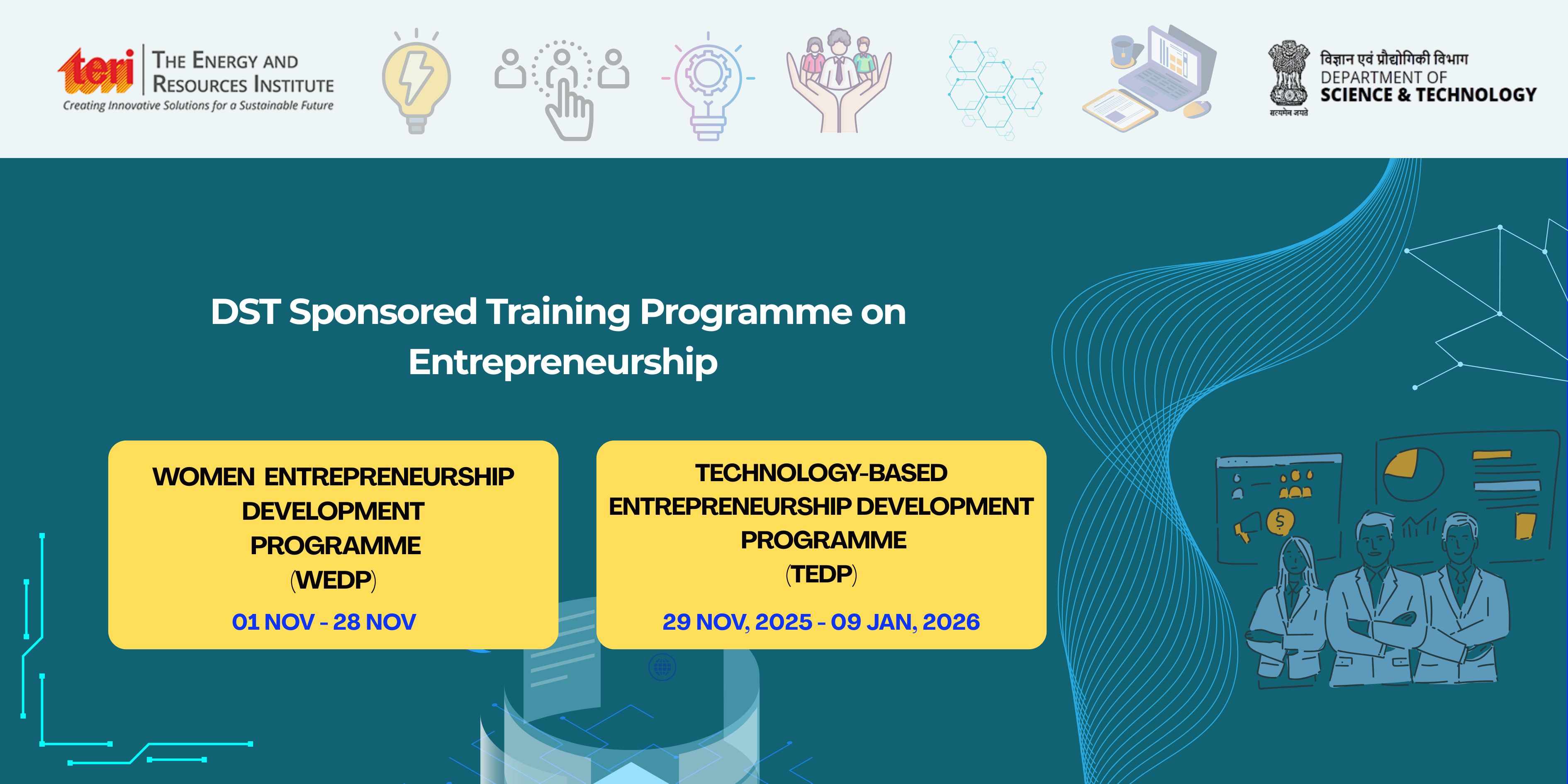 Entrepreneurship Development Programmes (EDPs) under the Department of Science & Technology scheme are designed to train potential entrepreneurs—primarily individuals holding a degree or three-year diploma in Science and Technology—through a structured curriculum over a specified duration. WEDP and TEDP are cohort-based, custom-designed technical entrepreneurship training program for graduates in science and technology domains with a focus on innovation and impact. WEDP is a structured 4-week program, while TEDP spans 6 weeks.