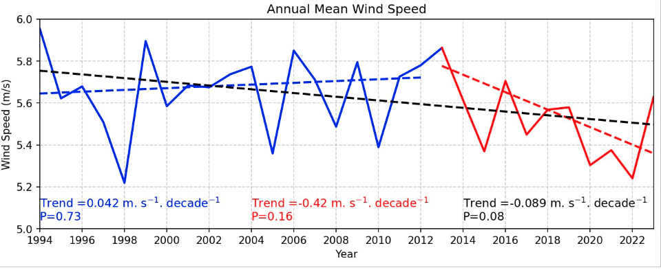 Strong winds (good for power) are becoming less frequent.