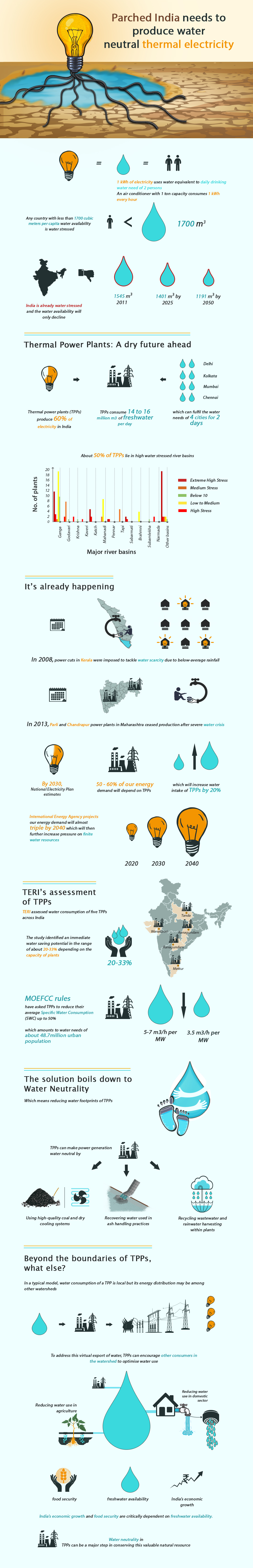 With a total installed capacity of 226 GW, thermal power plants in India produce about two thirds of the electricity. These plants consume about 14 to 16 million cubic metres of water per day. India's per capita water availability is less than 1700 m3, making the country already water stressed. An increase in water consumption for electricity generation limits water availability for other consumers in agriculture and domestic sectors.
